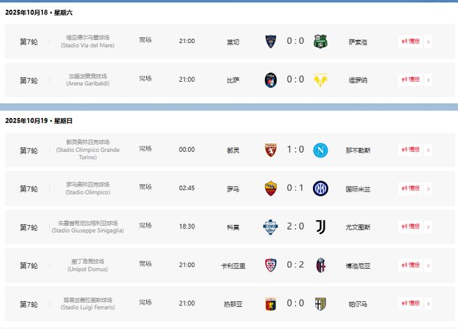 已经结束的7场比赛出现了3场0-0,分别是热那亚vs帕尔马、莱切vs萨索洛、比萨vs维罗纳。