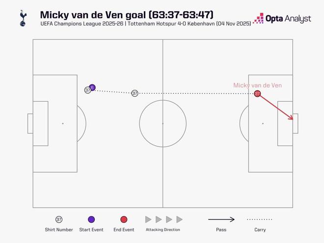 欧冠联赛阶段第四轮,热刺主场4-0大胜哥本哈根,热刺后卫范德芬在下半场长途奔袭打入一球,范德芬带球奔袭距离为67.7米,为有统计以来欧冠最长的奔袭破门距离。
